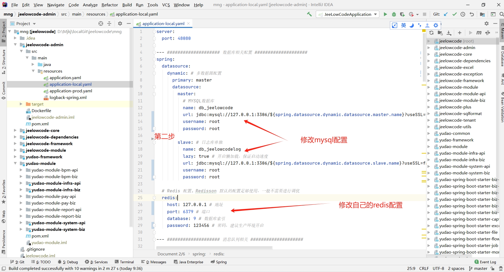 | 第二步:导入数据库文件到mysql中,并修改项目的数据库以及redis配置 |